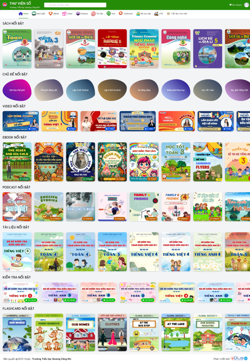 •  Sách giấy: Thư viện số Dlib K12 quản lý và số hoá sách thư viện theo chuẩn Dublin Core, giúp tìm kiếm và truy xuất thông tin dễ dàng. Môi trường số tiện lợi cho quản lý tài nguyên và mượn trả. Phụ huynh và học sinh dễ dàng tiếp cận nguồn tài nguyên, khuyến khích đọc sách tại thư viện hoặc mượn về nhà.